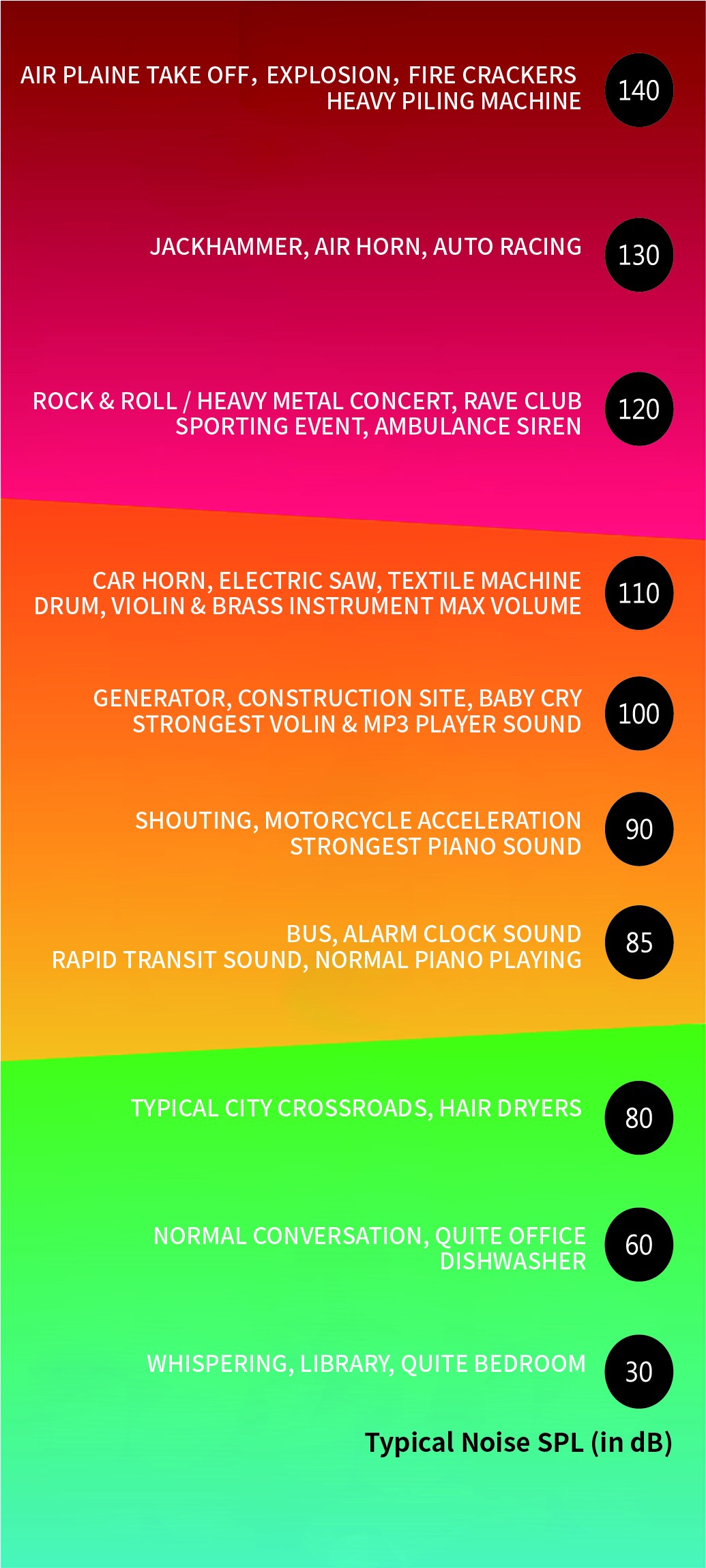 According to standards set by the International Organization for Standardization (ISO), the diagram on the left shows sound pressure values under various conditions. The softest sound a healthy human ear can detect is defined as 0 dB, while 140 dB is considered the upper limit. Exposure to sounds at 140 dB can cause immediate, temporary deafness — and in extreme cases, may even trigger strokes or cardiac arrest.