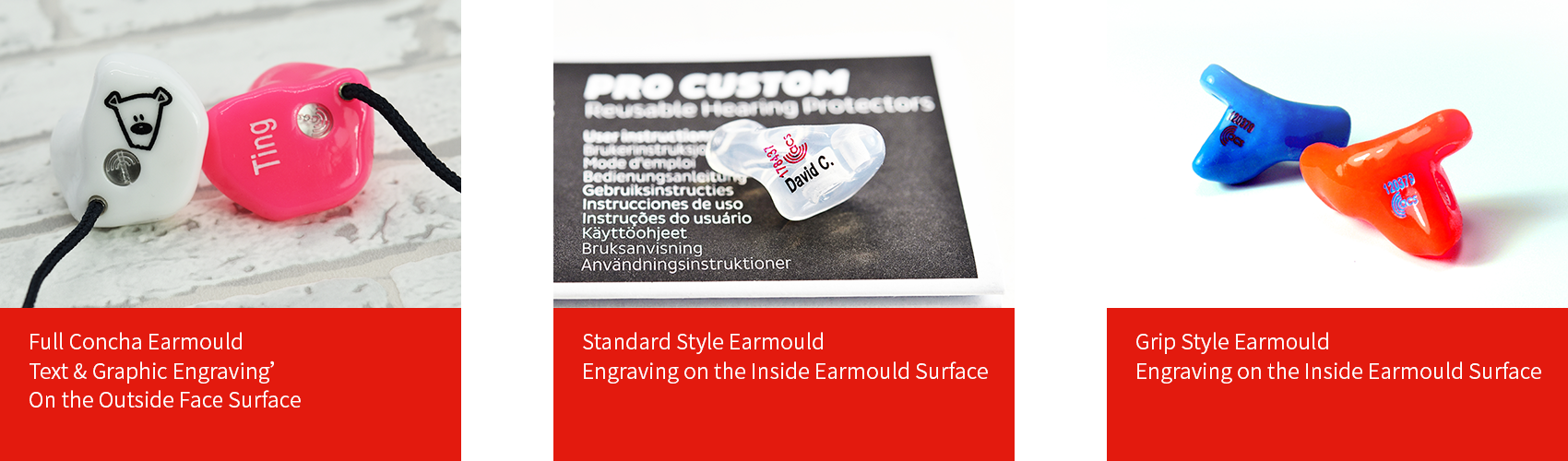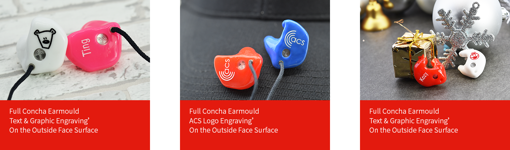 The engraved text can be made in red, blue, white, black, gold, or silver. The correct color choice should be a contrast to the earmoulds color.