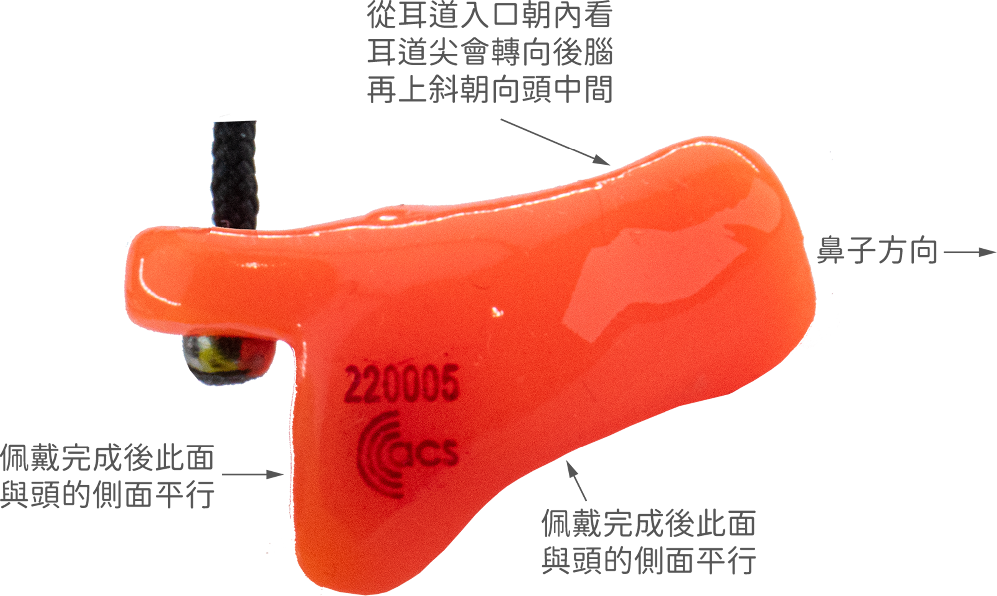 B. 用拇指和食指抓住耳塞上的把手,將耳塞刻著紅色或是藍色 ACS Logo和序號的平面朝著前方,將耳塞的耳道尖端放入耳道孔內。