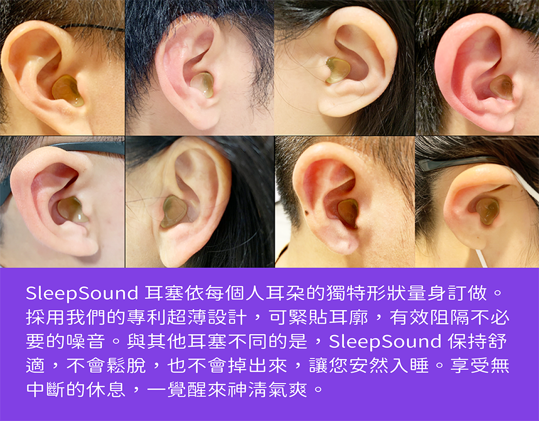 ACS SleepSound客製睡眠耳塞採用獨家配方的超軟醫級矽膠,根據每個人的耳朵形狀訂製而成。客製耳塞能深入內耳道,並勾住耳道內彎,固定其位置。因此,無論您在睡夢中如何翻身,SleepSound都能保持緊貼,不會鬆動,阻隔一切噪音,讓您安然入睡。