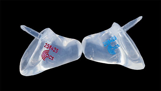 耳塞上有紅色與藍色的ACS Logo與耳模序號。