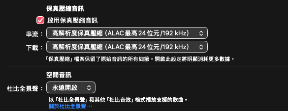 下圖為Apple Music 設定頁面截圖,請按圖中顯示來設定,以便獲得完整 24bit/96MHz音頻的串流和輸出。若是使用其他的音樂App播放音樂,請自行尋找適當設定來啟動高解析度音頻串流和輸出。不然耳機無法獲得高解析度音頻。