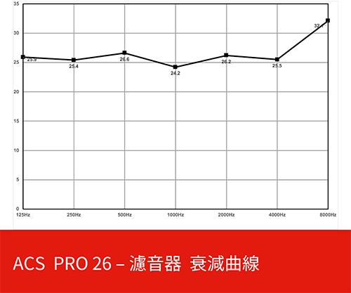 下面是 PRO 26 跟 PRO 27的衰減曲線。你可以看到,PRO 26從低頻到 4KHz都保持著約 26dB的衰減 (約 400倍),然後在 8KHz時迅速增加 達到 32.4dB(約 1600倍)。 PRO 27在低頻的衰減曲線比 PRO 26 的衰減曲線少了約 4分貝,但在高頻,衰減從 2KHz 25dB增加到 4K時的32dB (約 1600倍) 和 8K時的 34dB (約 2500倍)。如果您需要更多的信息,請點選下面鏈接進入 PRO26/27 工作用客製耳塞產品頁面,或是進入工業耳塞的概述頁面。