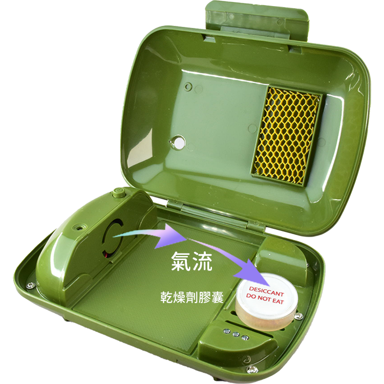 氣流中的水分被放置在回風口的乾燥劑膠囊吸收,變成乾燥的空氣透過在平台下方流回到風扇,再次被吹出。這個循環的乾燥空氣將不斷吸收從耳機中擴散出來的水分,並且促使動鐵單體內的液態水蒸發成濕氣,然後向外擴散。這樣連續的循環便能乾燥客製耳機或是助聽器的動鐵單體和電子部件。