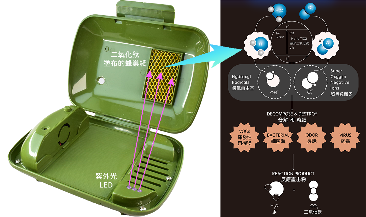 4.  380nm UV 和奈米顆粒二氧化鈦所產生的高效光觸媒反應,提供強勁的消毒清潔效率。